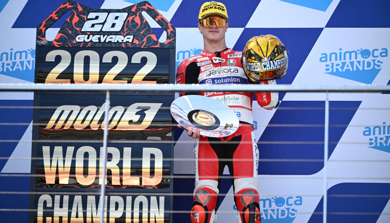 Izan Guevara (GasGas) consiguió una magistral victoria el circuito de Phillip Island con la que ha logrado proclamarse matemáticamente campeón del mundo de Moto3, el séptimo de la categoría y el vigésimo tercero del motociclismo español, después de una intensa batalla con el turco Deniz Öncü (KTM), el español Sergio García Dols (GasGas) y el japonés Ayumu Sasaki (Husqvarna).