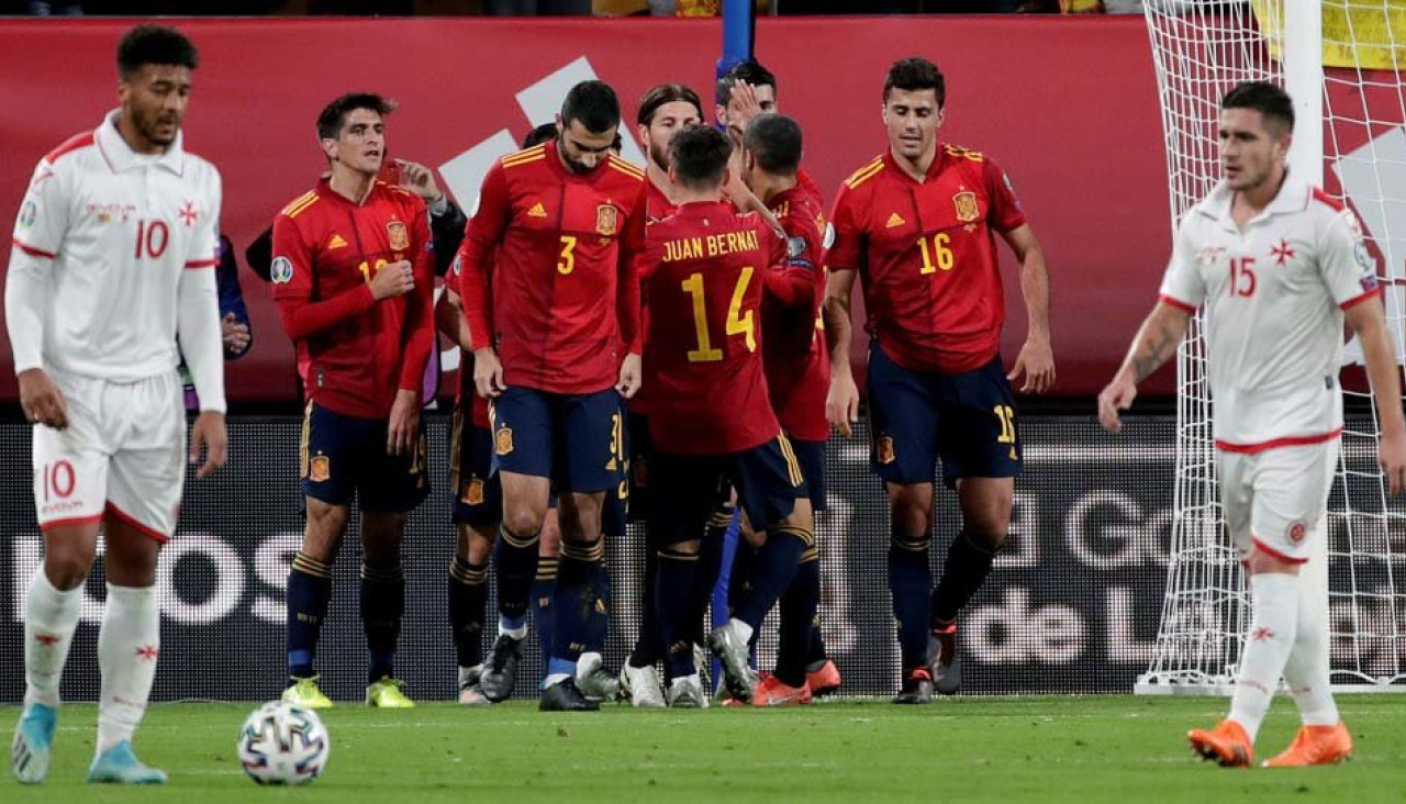 La selección española se dio un festín anoche en el estadio Ramón de Carranza y goleó con absoluta facilidad a Malta (7-0) en la novena y penúltima jornada de la fase de clasificación para la Eurocopa 2020, con lo que los de Robert Moreno se aseguran ser primeros de grupo.